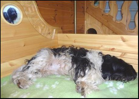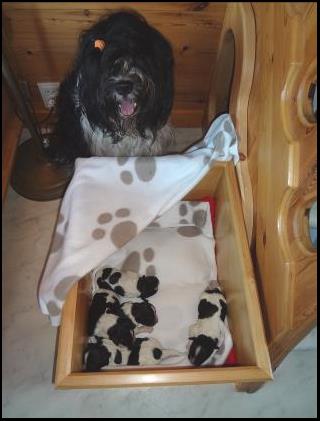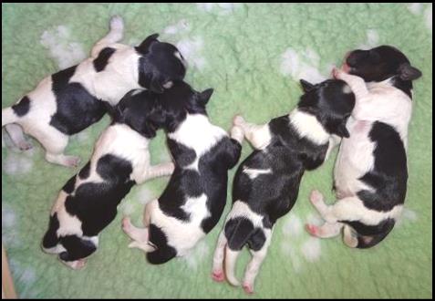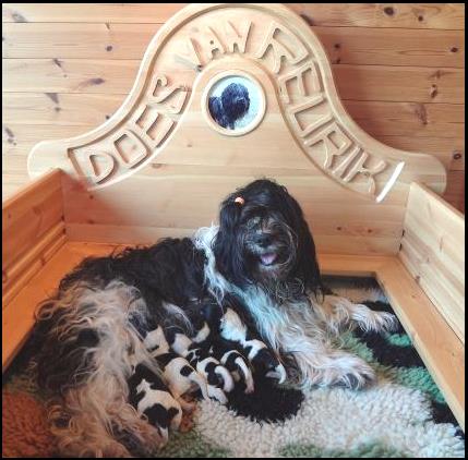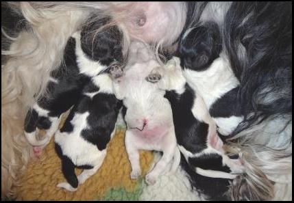 Wisper heeft een zware bevalling gehad, maar heeft op 20 maart toch vijf mooie pups op de wereld gezet. Twee teefjes en drie reutjes. Het lijkt er op dat er één reutje een echte blauwkous gaat worden en de andere vier zwart wit blijven, al hebben we al wel wat bruine wangetjes en billetjes gezien. Bij een Schapendoes weet je het echter maar nooit, daarom geven we geen kleurgarantie. Het blijven toverballetjes. |