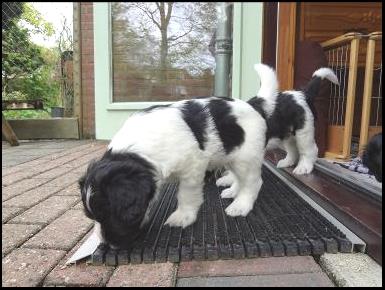De pups zijn hier nu al vier weken oud. De tijd dat ze bij ons zijn is nu voor de helft voorbij. Rechts een speciale foto van Tymo en Baya. Oud ontmoet jong! |
