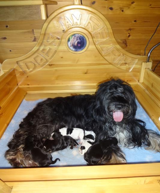 Van zondag op maandagnacht 10 oktober 2016 werd Venco erg onrustig, waardoor ze aangaf dat haar TiCo kids in aantocht waren. Later op de dag bleken haar weeën door te zetten en uiteindelijk heeft Venco in drie uur tijd vijf gezonde pups op de wereld gezet met de kleuren black & tan, zwart en lichte blauwschimmel. Venco en Ties zijn nu trotse ouders van het F–nest, twee teefjes en drie reuen met flinke gewichten! Alle TiCo pups zijn nu bij hun nieuwe baasjes. |